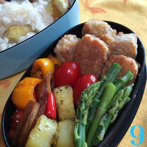 今日のお弁当 栗ご飯 プチトマト 茹でアスパラ テンペの唐揚げ フィンガリングポテトのソテー スイートペッパーとタマネギのビネガー炒め冷蔵庫にあるもので作るので、おかずは大体いつも同じな上、茶色がち。