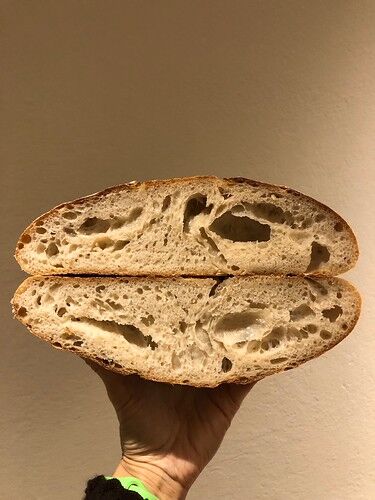 あぁ、ようやく ちょっとばかり大穴気味ではあるけれど、かなり改善。 粉:Central Milling All-purpose一次発酵:室温約10時間冷蔵約8時間87度1時間二次発酵87度1時間半Lodge 500度予熱 428度蓋付き20分 フタ無し8分普通オーブン